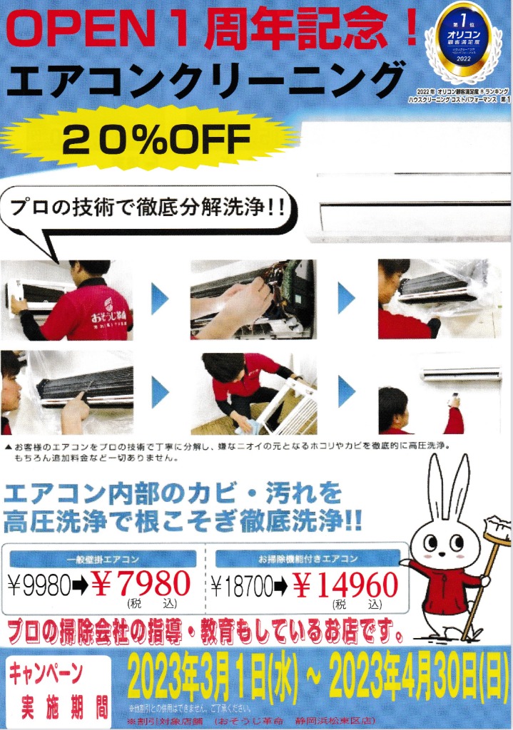 おそうじ革命浜松東区店では、3月1日から4月30日までの期間【1周年記念キャンペーン】を開催します!エアコンクリーニングが通常価格から“20%オフ”となっております。